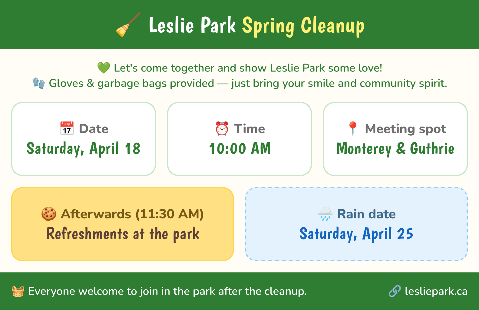 Spring Cleanup: April 18, 10 AM Rain date: April 25